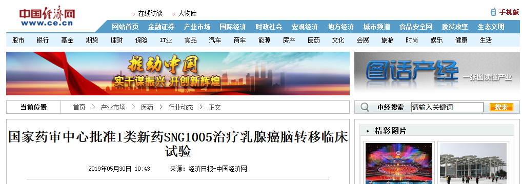 2019年5月29日,国家药品监督管理局药品审评中心已批准北京盛诺基医药科技有限公司在中国开展“一项化药1类新药注射用SNG1005治疗既往全脑放疗后脑实质进展的HER2阴性乳腺癌脑转移患者的多中心、随机对照、开放标签临床试验”(受理号:JXHL1900058)