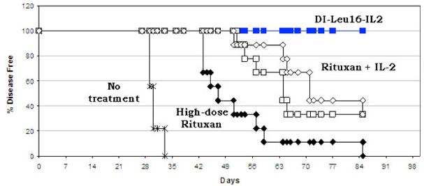 SCID小鼠体内针对NHL的体内活性。。在第33天,所有未经治疗的小鼠都死亡。高剂量利妥昔单抗治疗的患者在85天内的死亡率为100%。使用Rituxan(一种抗体)和IL-2(一种细胞因子)的组合治疗可改善结局,但甚至无法接近免疫细胞因子融合蛋白DI-Leu16-IL2的有效性。最初用Rituxan + IL-2治疗的SCID小鼠的结果比单独使用Rituxan更好,但到85天时,大多数再次死于疾病。形成鲜明对比的是,用DI-Leu16-IL2治疗的SCID小鼠在整个生存期中都存活了100%测试期(至第113天,未显示),这意味着NHL的理论治疗方法。Alopexx Oncology于2016年第四季度完成了DI-Leu16-IL2的I/II期研究。正在考虑与其他免疫检查点抑制剂或生物制剂联合使用。