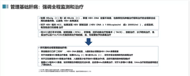 NCCN指南要求重视肿瘤治疗期间HBV再激活,CSCO指南专门就抗病毒治疗和保肝、利胆治疗提出了指导原则。首选强效低耐药的抗病毒治疗药物,恩替卡韦、富马酸替诺福韦酯和丙酚替诺福韦酯。